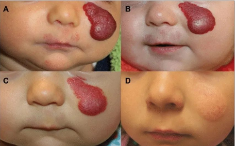 比如肚子上的小血管瘤,可以积极的观察[8],就是每月拍照监测其大小变化,等其自行消退,过程中可以请皮肤科医生评估。如果能接受可以继续等待,如果感觉不能接受及早开始治疗,但这种可能错过好的治疗时期,之后需要联合其他手段进行处理。当然,更积极的治疗,早发现早评估,如果适合就采用药物干预,遗留后遗症的风险会更低,这是为什么推荐在增殖期结束前给予治疗的原因。