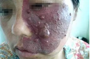 中期症状:皮肤变大,色泽变深,呈暗红色,表面粗糙,不退色,对病人的外貌有很大的破坏作用。