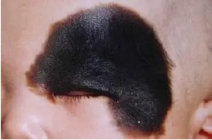 皮肤会凸出,呈乳头状,皮肤呈黑色,表面粗糙,有些地方只有少量的头发,有些则比较茂盛,比较黝黑。